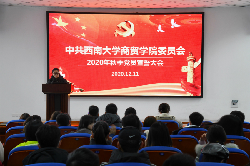 学院组织员刘莉莉老师现场宣读了《中共西南大学商贸学院委员会关于学生党员发展转正的通知》。随后,2020年秋季发展的预备党员和转正的预备党员在领誓党员带领下,面向鲜艳的党旗,列队整齐,在党旗下庄严宣誓。同时,其他党员同志重温入党誓词,郑重宣誓。