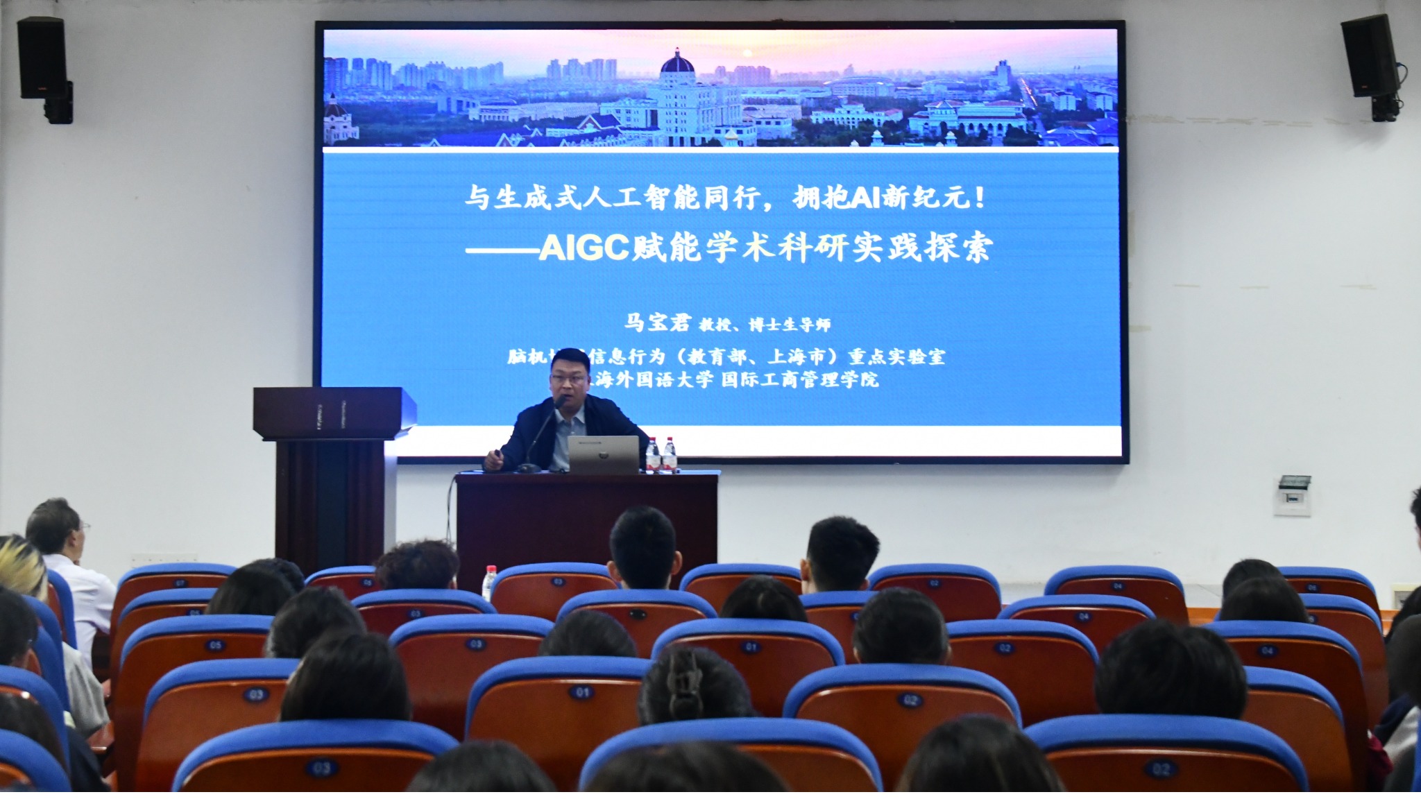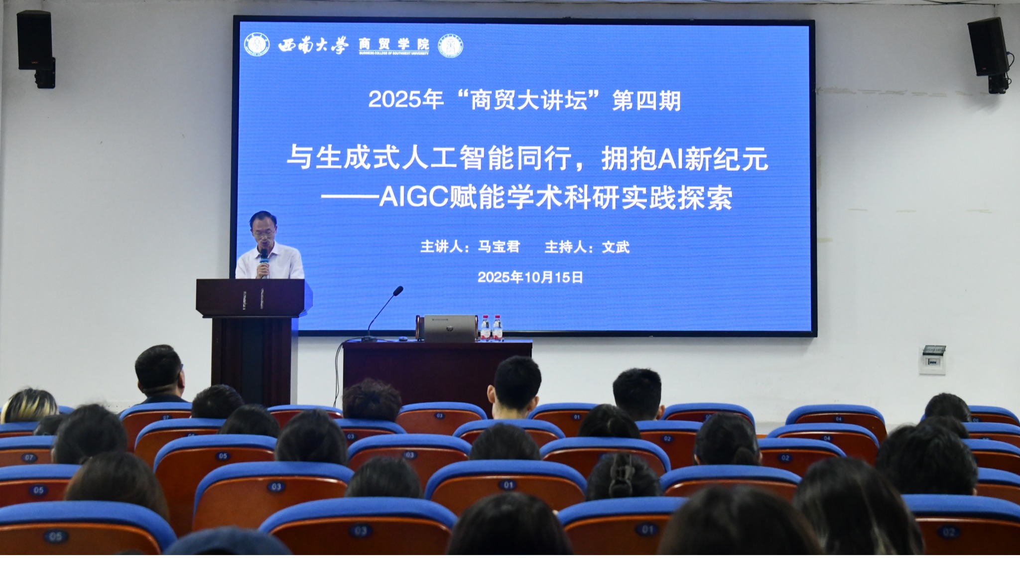 10月15日,商贸学院在9601报告厅顺利举办第四期“商贸大讲坛”——“与生成式人工智能同行,拥抱AI新纪元--AIGC赋能学术科研实践探索”专题讲座。本次讲座特邀上海外国语大学马宝君教授担任主讲,学院党委副书记文武主持,吸引了众多师生积极参与。