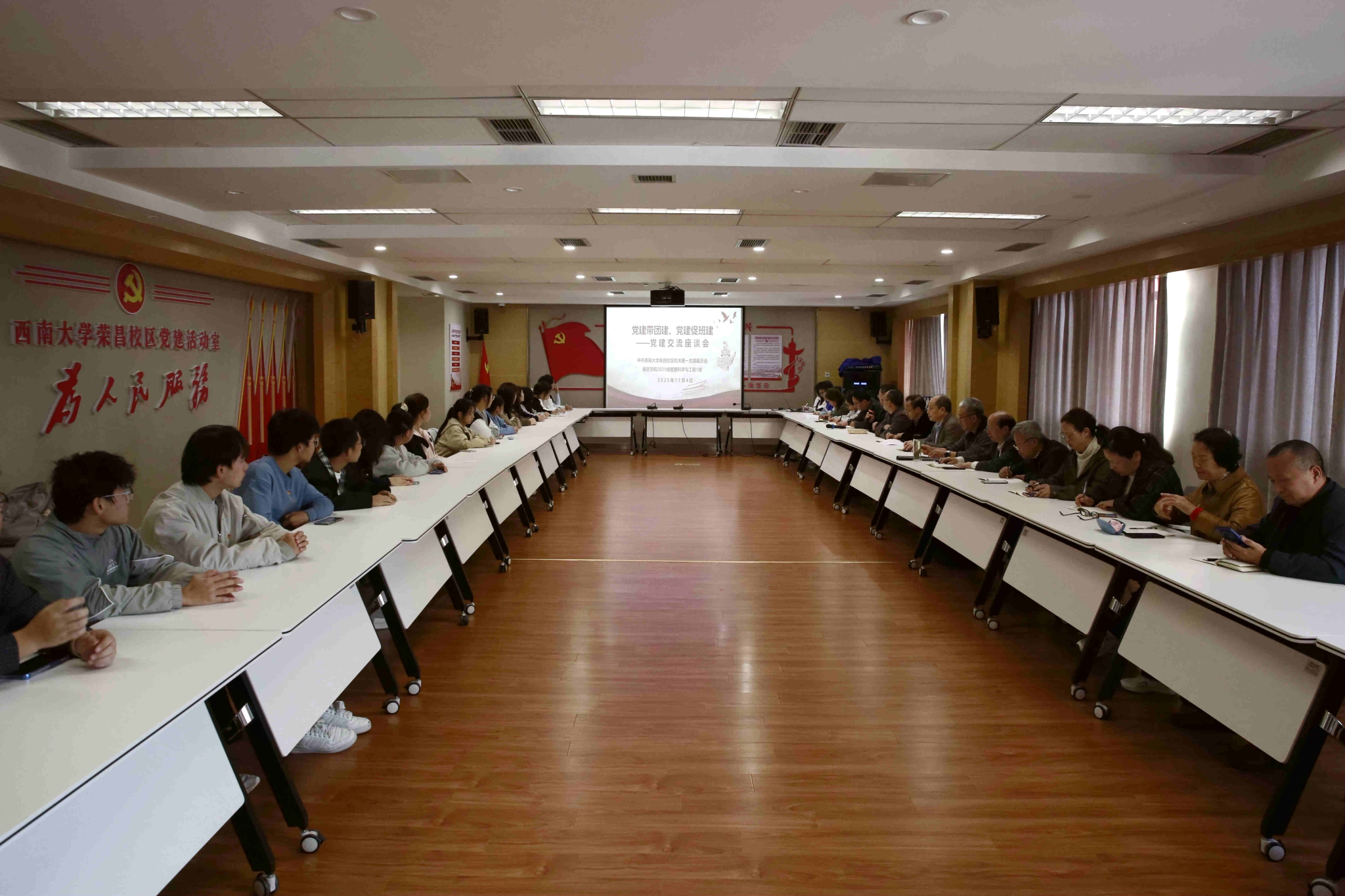 11月4日,荣昌校区机关第一党支部联系2025级管理科学与工程1班召开“党建带团建、党建促班建”交流座谈会,以党的建设带动基层班团建设。荣昌校区党工委书记、管委会主任周国安、副处级组织员包尔泉、机关党总支书记周克勇,学院党委副书记、纪委书记文武,荣昌校区管委会副主任兼 2025级管理科学与工程1班班主任曹烈斌,荣昌校区机关第一党支部全体党员、2025级管理科学与工程1班全体学生、2022级信管3班团支部书记与班长共同参会。座谈会由校区机关第一党支部书记蒋兴主持。