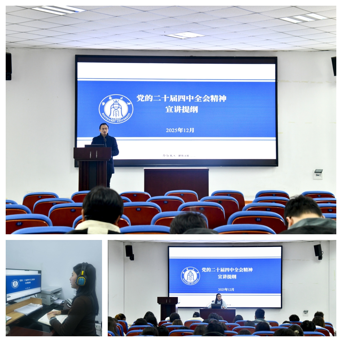 各宣讲人紧扣党的二十届四中全会精神的核心要义,从大会召开的时代背景和重大意义入手,结合详实的理论分析和生动的实践案例,对党的二十届四中全会精神进行全面系统、重点突出的解读。宣讲立足重庆市的战略定位和发展实际,将党的二十届四中全会精神的贯彻落实与地方经济社会发展规划有机结合,详细介绍重庆在推动高质量发展、深化改革开放、提升民生保障水平等方面的政策导向和具体实践,引导师生深刻认识个人发展与时代进程、国家命运的紧密联系。宣讲人还宣讲了学校贯彻落实全会精神的工作举措,全面呈现学校学习贯彻全会精神的创新实践和进展成效,营造良好的学习宣传贯彻全会精神的浓厚氛围。