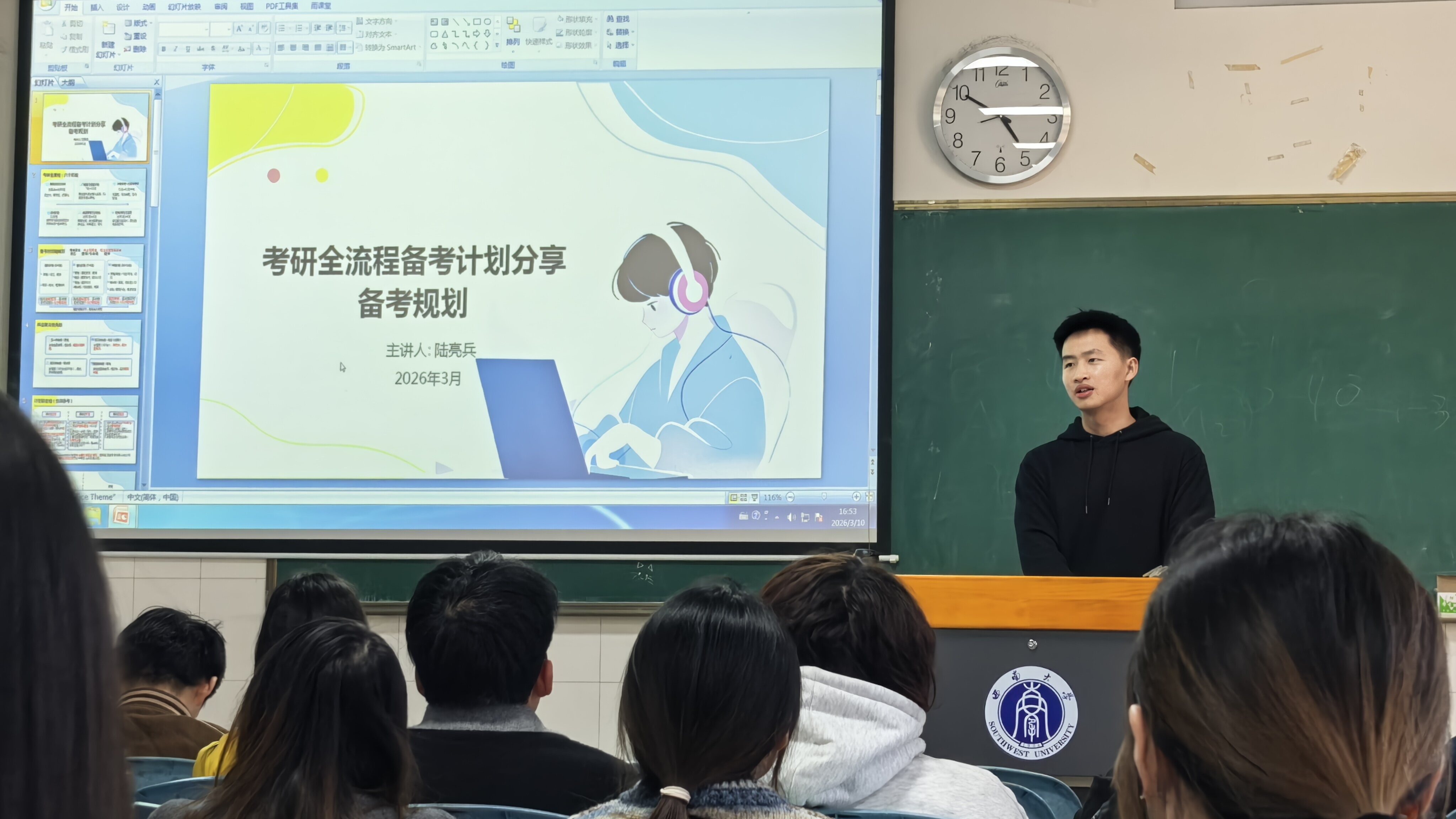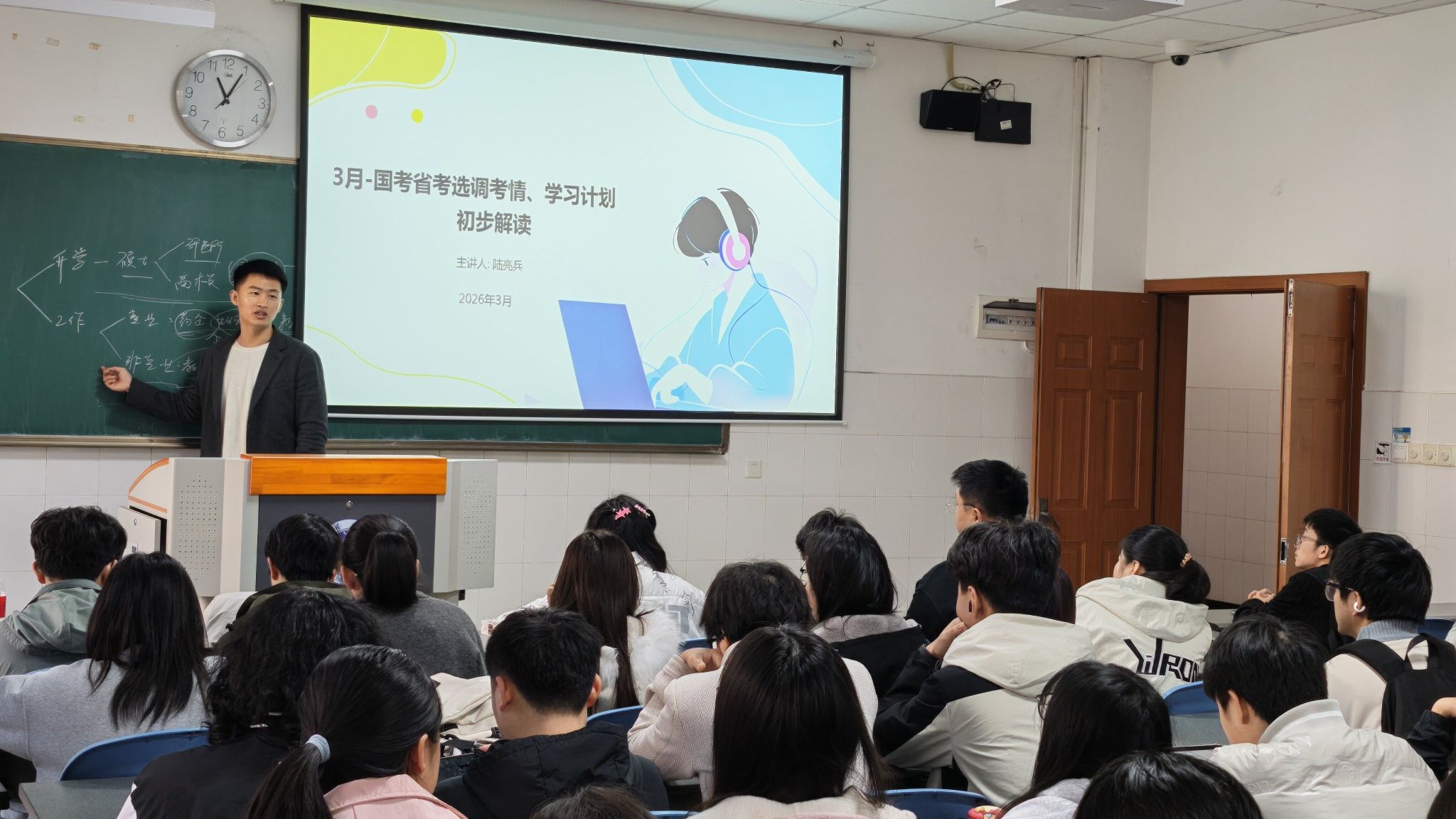 针对学生在考研、考公备考中存在的学习计划无序、择校择岗迷茫、备考资料筛选困难等现实困惑,学院本科生第二党支部充分发挥“领头羊”引领优势与组织凝聚力,于本月精心推出考研考公专题系列辅导讲座,切实为学子备考保驾护航。本次讲座由23级辅导员陆亮兵携手本科生第二党支部优秀党员共同主讲,结合当前研考公招考新形势、新政策及学院学科特色,聚焦备考规划、择校择岗、岗位分析等核心环节,分享实用备考计划与资料选择方法。此次讲座参与学生达260人次,现场互动氛围热烈,与会学生纷纷表示,讲座内容干货满满、针对性极强,有效帮助大家明晰了备考方向、理清了备考思路,为后续高效备考奠定了坚实基础。